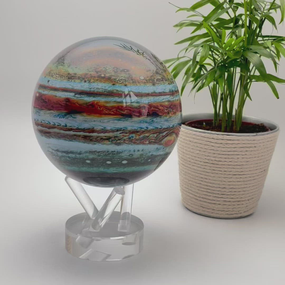 - Experience the magic of the MOVA Planet Jupiter 4.5" Globe! This captivating celestial replica spins effortlessly without batteries or wires, using only light for power. Its silent rotation creates a mesmerizing display that will transform any space