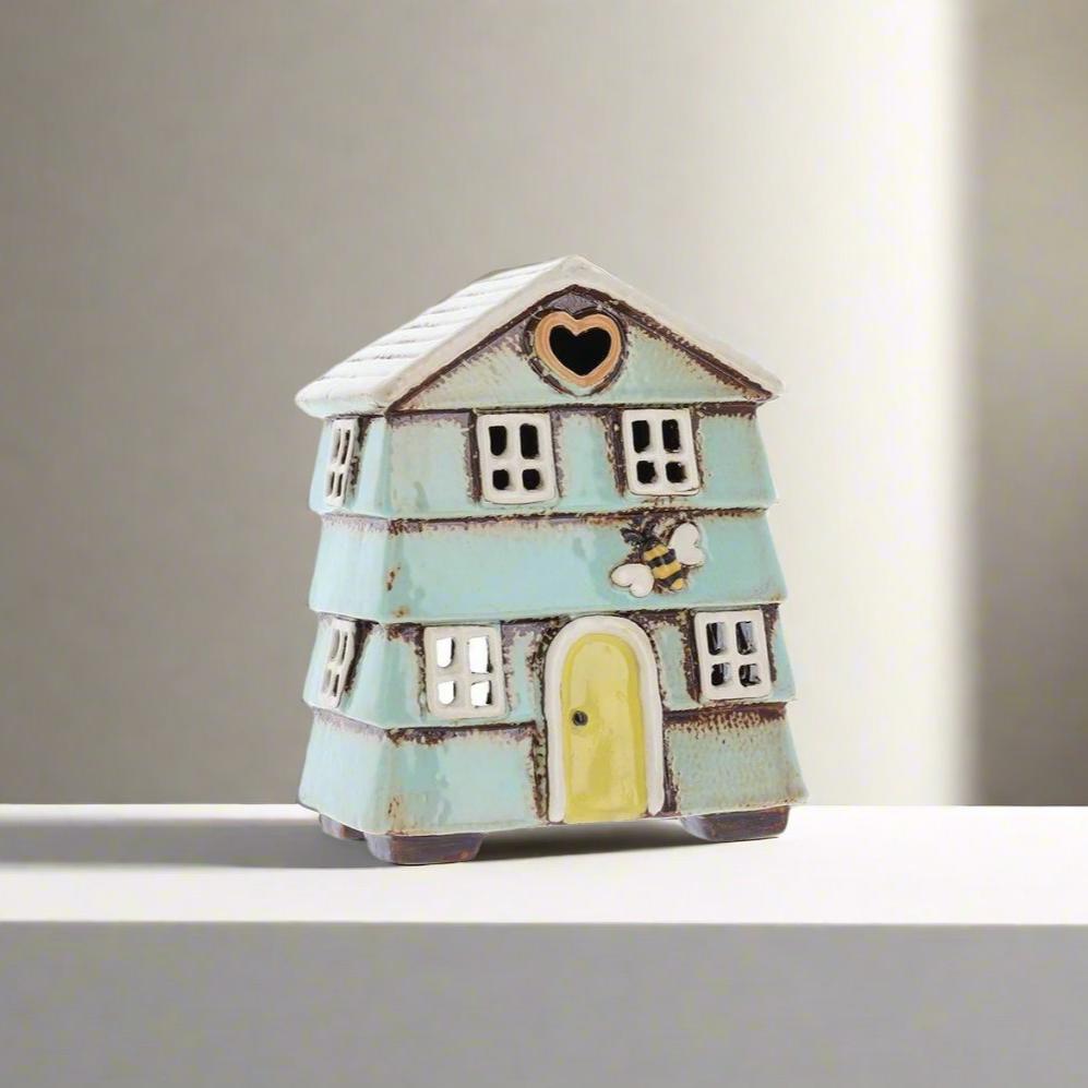 - The aqua beehive tea light holder is part of the Village Pottery range, it adds a touch of charm to any room with its ceramic construction, yellow front door, heart shaped window, and bee decoration.