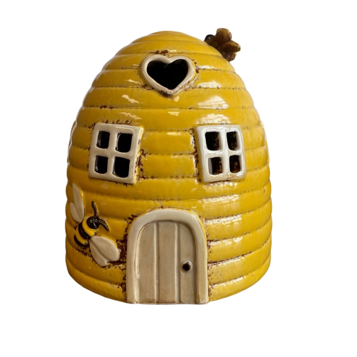 - This beehive-shaped tea light holder is crafted from pottery and glazed in yellow with a dome shape