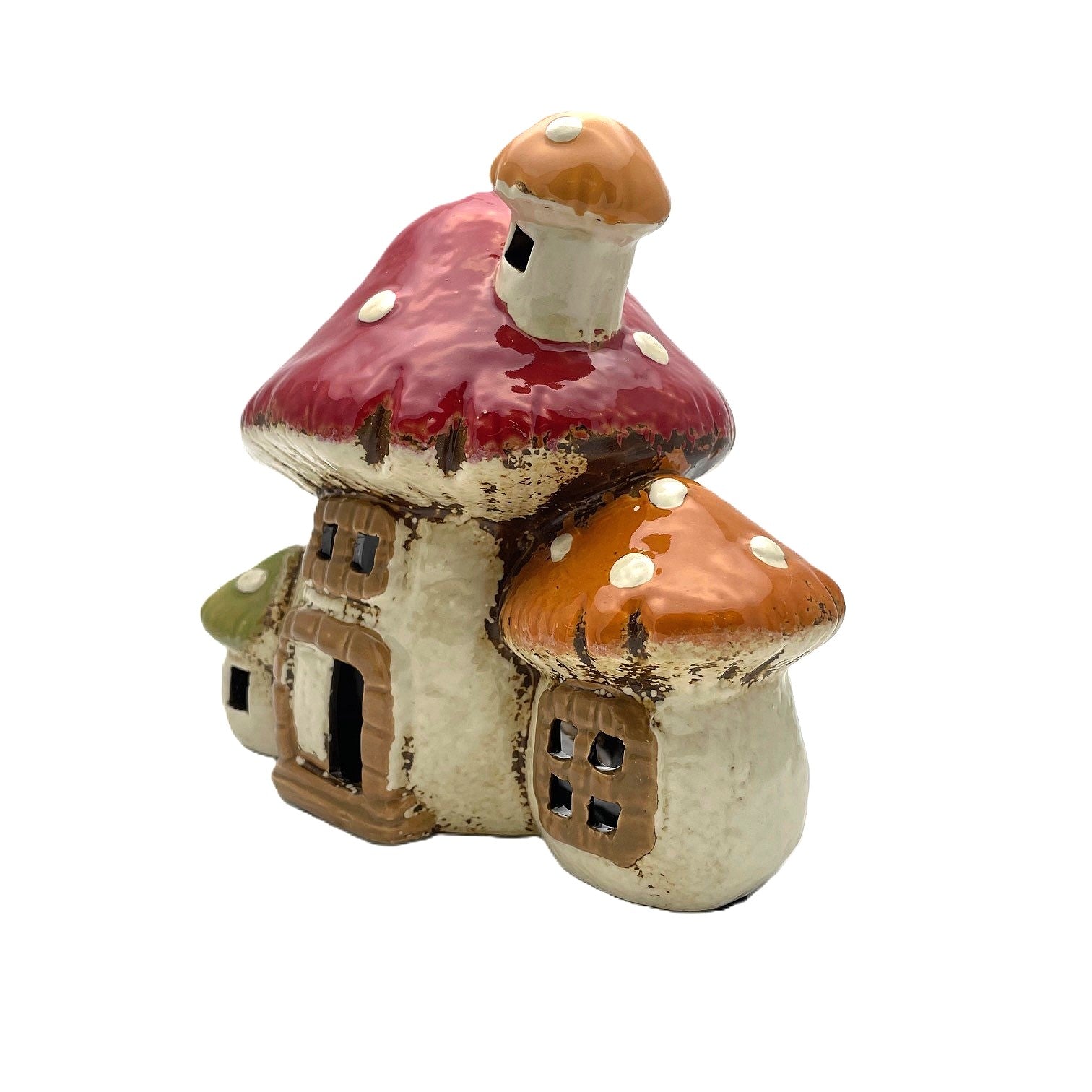 - This triple toadstool shaped tea light holder is crafted from pottery and glazed