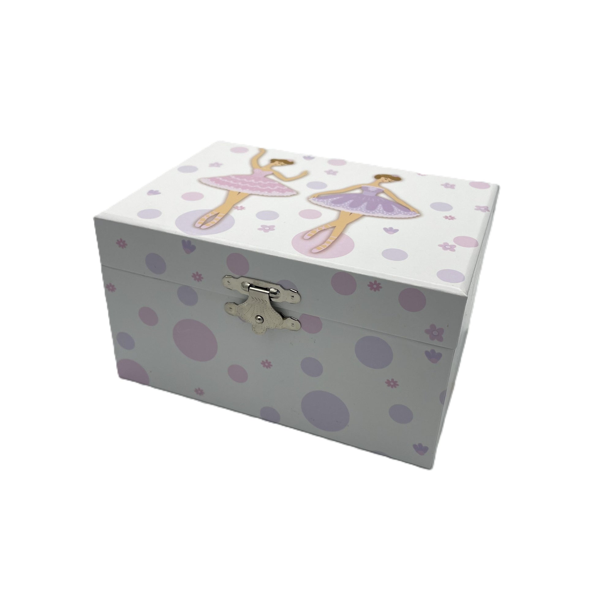 - Outside is decorated with ballerinas, flowers and dots with metal hinges and catch with a wind up key at the back