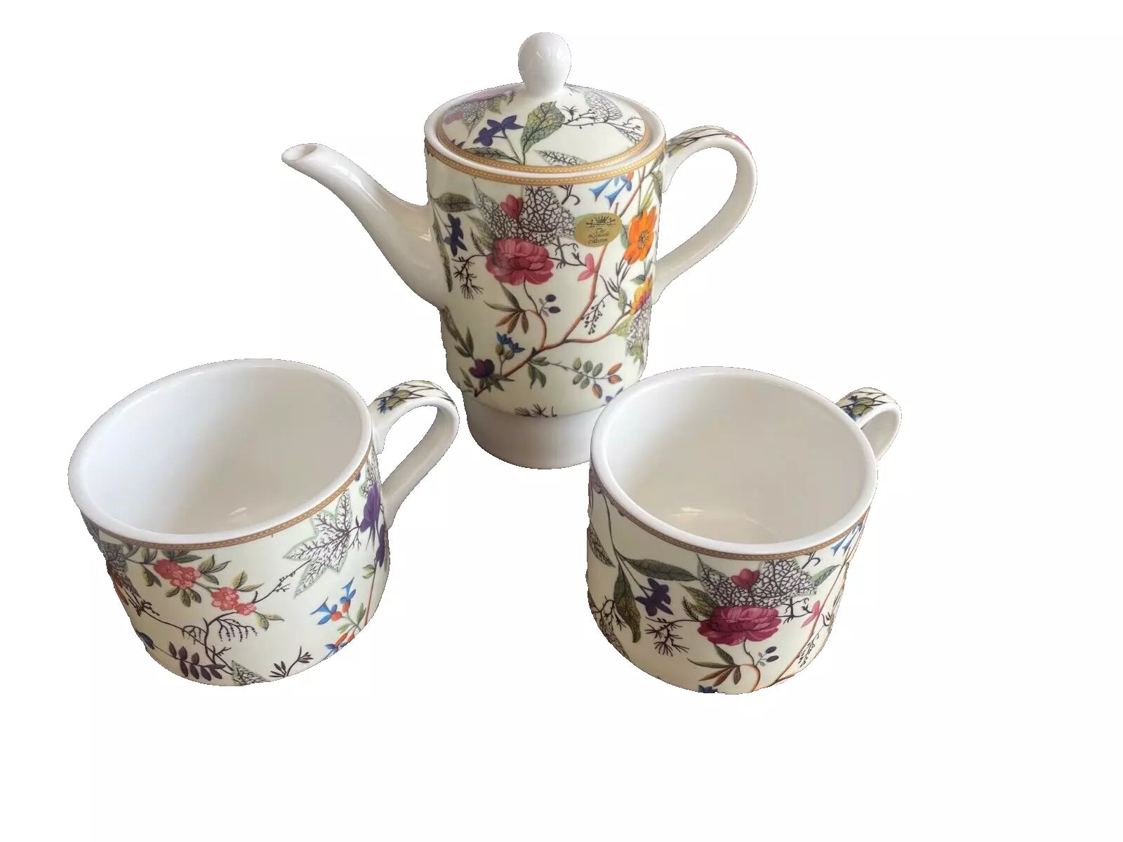 - Set for two includes teapot and 2 cups that stack together Finished with the William Kilburns floral pattern